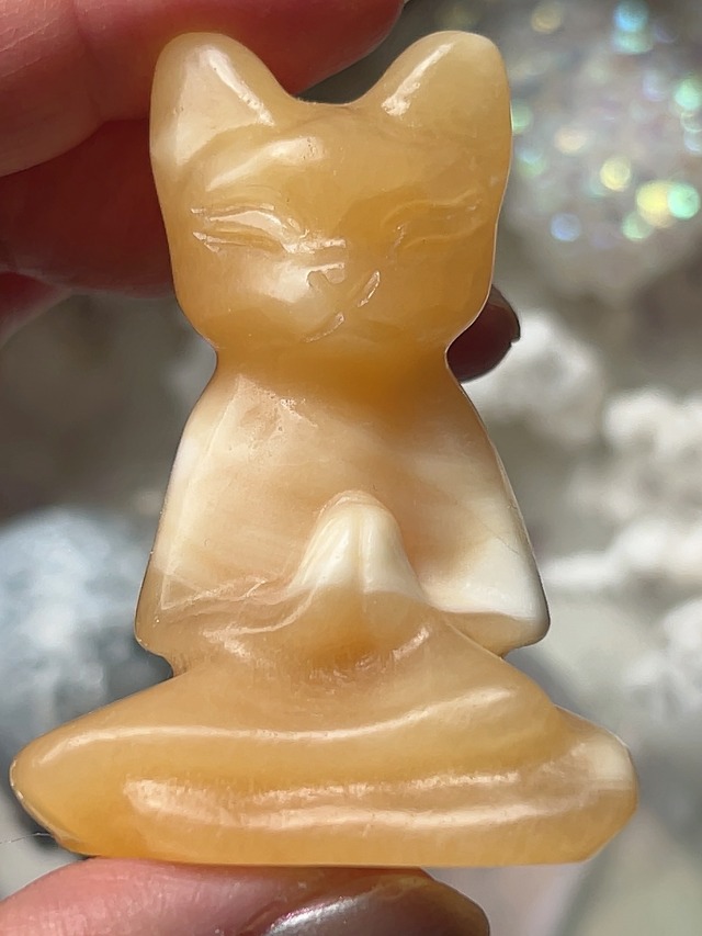 可愛いお顔の瞑想してるオレンジカルサイトのねこさんです♡ 白いお色も入っててとても可愛い色味で瞑想してるお顔もcuteです❤︎ ツルツルの可愛いにゃんこちゃんです♡ オレンジカルサイトは、太陽のような明るいエネルギーで心身を活性化し、ポジティブな思考と高い行動力をもたらすパワーストーンです。感情の安定、創造力の向上、人間関係の円滑化、さらに金運や繁栄をもたらす効果があるとされ、前向きな変化やチャンスを呼び込むお守りとして人気があります。 size 縦6㎝ 横4.2㎝ 重さ70g