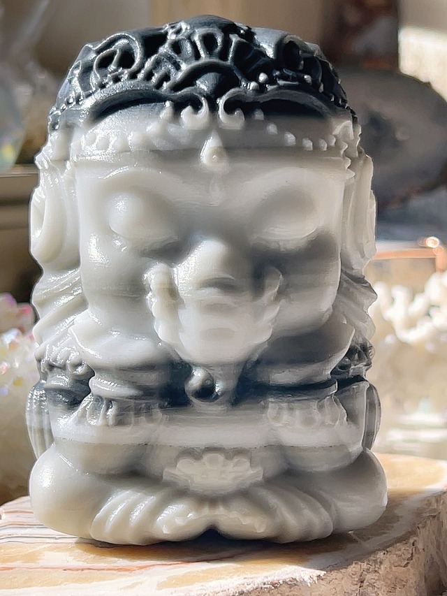 ♡可愛すぎる大きなグレーガネーシャちゃん♡ コロンとしていて大きな可愛いタイジストーンガネーシャちゃんです♡ 余りにも可愛すぎてキュンキュンです❣️ オシャレな彫りで❤︎ 落ち着いたグレーカラーがとても可愛いくて撮影しながらキュンキュンしました☆ ✨ 夢の国からやって来たガネーシャちゃん♡ 愛いっぱい!幸運と富、成功をもたらしてくれるでしょう❤︎ 可愛すぎます❤︎ 足やまつ毛にキュンキュン☆ ガネーシャは、インド神話に登場する象の頭を持つ神で、障害を取り除き、成功、富、知恵、幸運をもたらす「スピリチュアル」な存在とされています。 特に、商売繁盛や学問の成就、そして困難を乗り越えたい時に礼拝されることが多く、置物やアクセサリーなどを身近に置くことで、その恩寵を受けることができると信じられています ガネーシャの置物を風水の玄関に置くことは、困難を取り除き、金運や商売繁盛、学業、そして幸福をもたらす効果があるとされています。 玄関は幸運の入り口であり、ガネーシャは障害を除去する神として人気が高く、置くことで様々な運気を高めることが期待できるため、おすすめの風水アイテムです size 縦9.8㎝ 横6.8㎝ 重さ687g #タイジストーンガネーシャ #タイジストーン