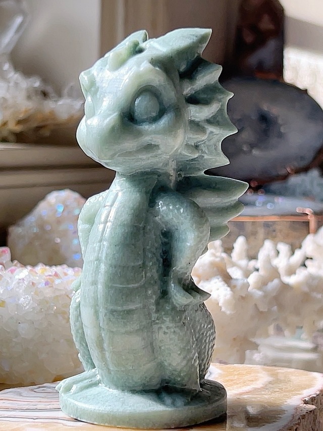 ★エッヘン!とっても自信ありのグリーンドラゴン君☆ とってもcuteなルーサンjadeのドラゴン君です★✨ 可愛い自信ありげな仕草でお顔もニコニコ☺︎ 可愛いすぎます❣️ 一緒にいっぱい楽しいことしたいと言ってます☆ 見てるだけで元気を貰えるお茶目なドラゴン君です★ スピリチュアルにおけるドラゴンは、幸運・飛躍や浄化・守護の象徴とされています。 特に「昇り龍」は立身出世や運気上昇の願いが込められており、水や豊穣、財運を司る「龍神」としても信仰されています。 一方で、人間の心の奥底に潜む「力」や「変化」を象徴する存在とも考えられています size 縦10.1㎝ 横4.4㎝ 重さ205g #グリーンjade #グリーンjadeドラゴン