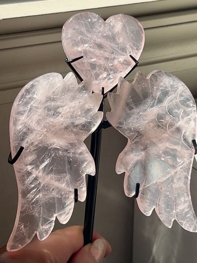 ☆ 可愛い過ぎる素敵なHEART&WING☆ とってもCUTEで可愛い過ぎる煌めきいっぱいの素敵な甘いローズクォーツHEART&WINGです♡✨ 赤みのピンクが可愛くて煌めきに魅了されるとっても美しいローズクォーツheartwingにうっとりします❣️ レインボーがキラキラで最高に可愛いです♡ レインボーも凄くて可愛過ぎますよね☆ 飾った瞬間に余りにも可愛すぎてドッキュンでした♡ 遠目からでも可愛さが際立ちます❤︎ とっても可愛くてオシャレ❣️ 可愛いお色でオシャレさん☆ ローズクォーツは「愛と美の星」ヴィーナスを象徴する、恋愛運向上と深い癒しのパワーストーンです。 失恋の傷を癒やし、自分を愛する「自己肯定感」を高め、新たな出会いや結婚のチャンスを呼び込むとされています。人間関係の調和や内面的な美しさを引き出したい方にも適しています。 size 縦16.7㎝ 横12.2㎝ #ローズクォーツ #ローズクォーツheart wing