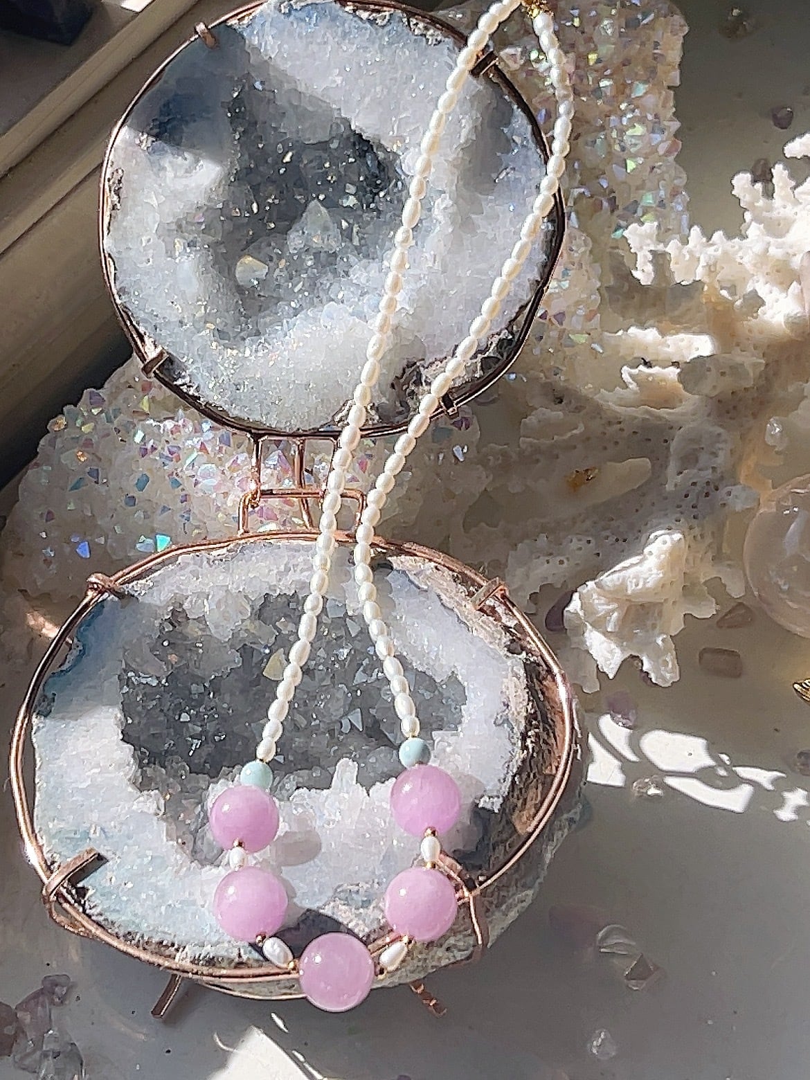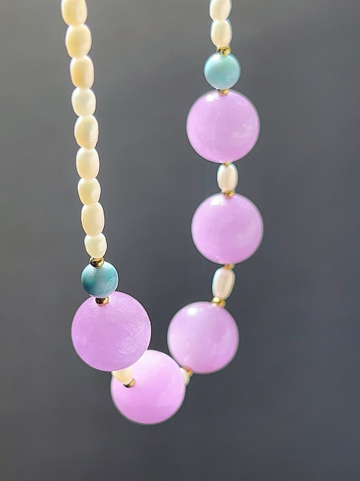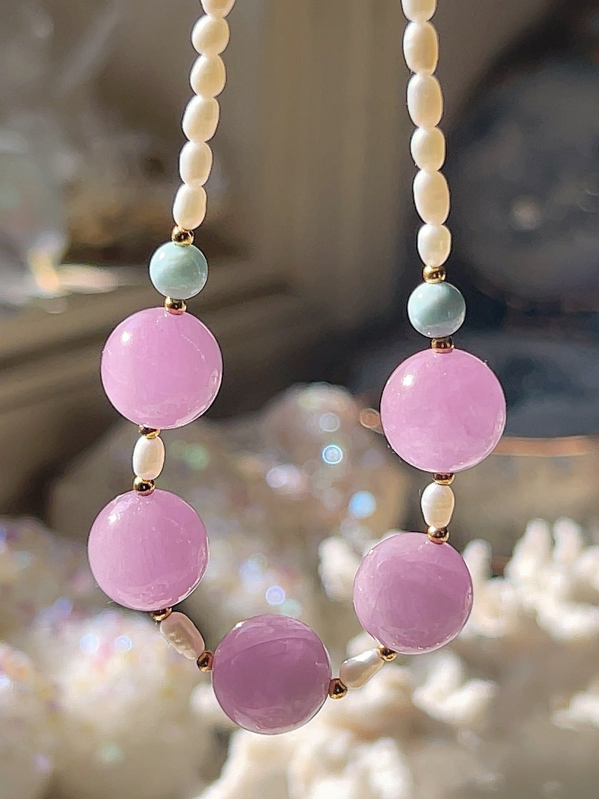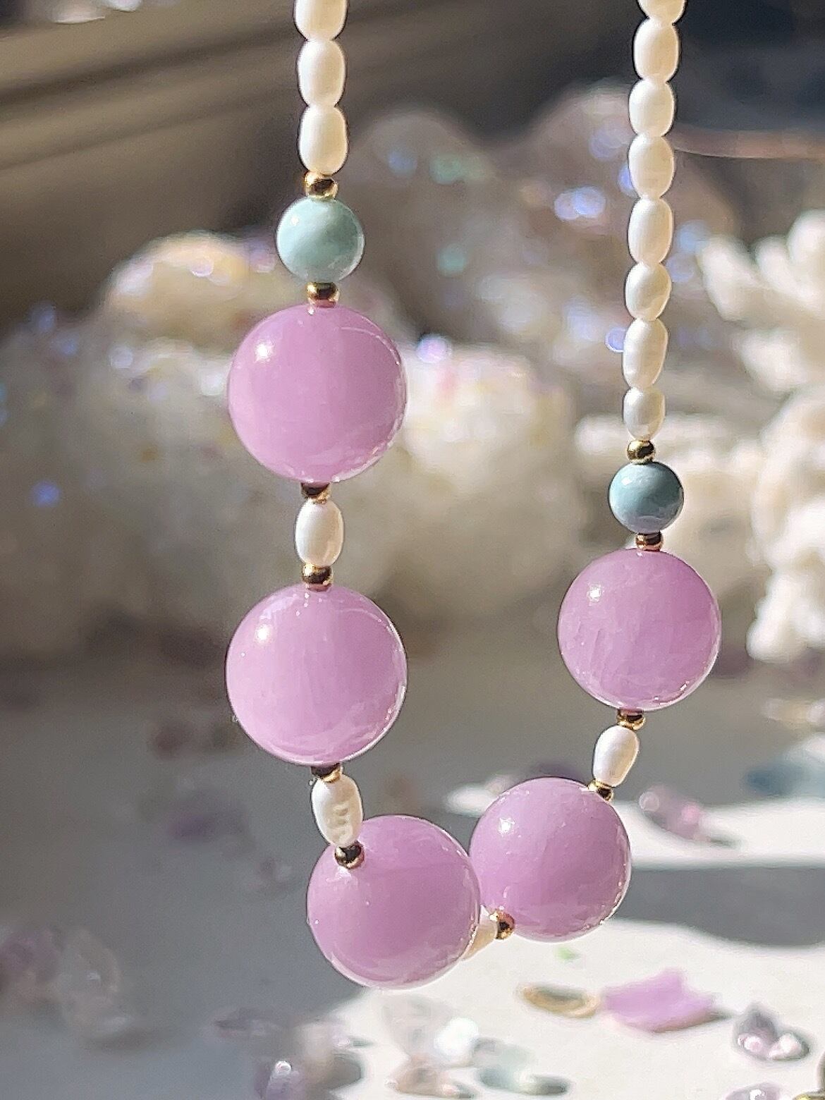 フェミニンなクンツァイトとラリマーとオパールのネックレスです♡✨