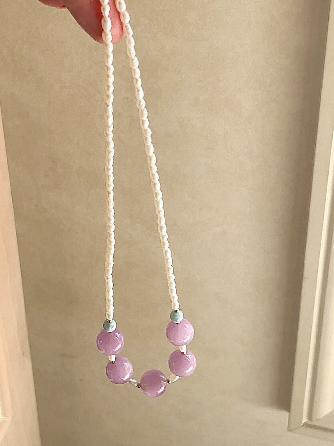 フェミニンでパープル、水色、ホワイトなどの可愛いカラーの組み合わせがとても素敵なネックレスです☆