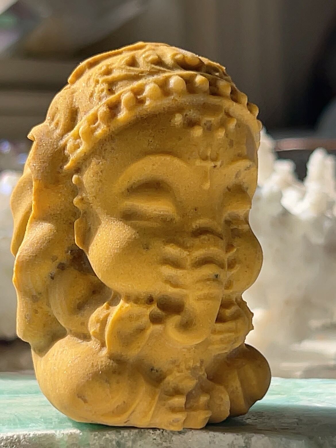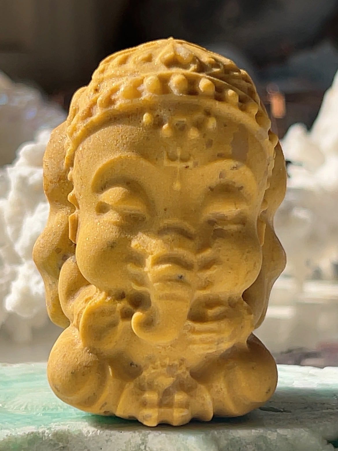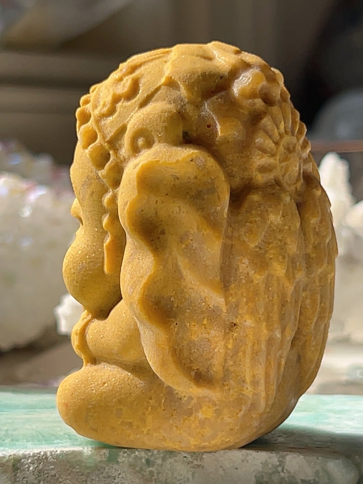 イエロージェイド(黄翡翠)のガネーシャは、富・幸運・知恵をもたらし、目標達成、金運、ビジネス運、人間関係、心身の安定、魔除けに効果があるとされます。