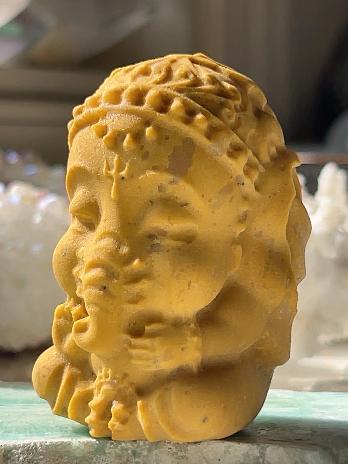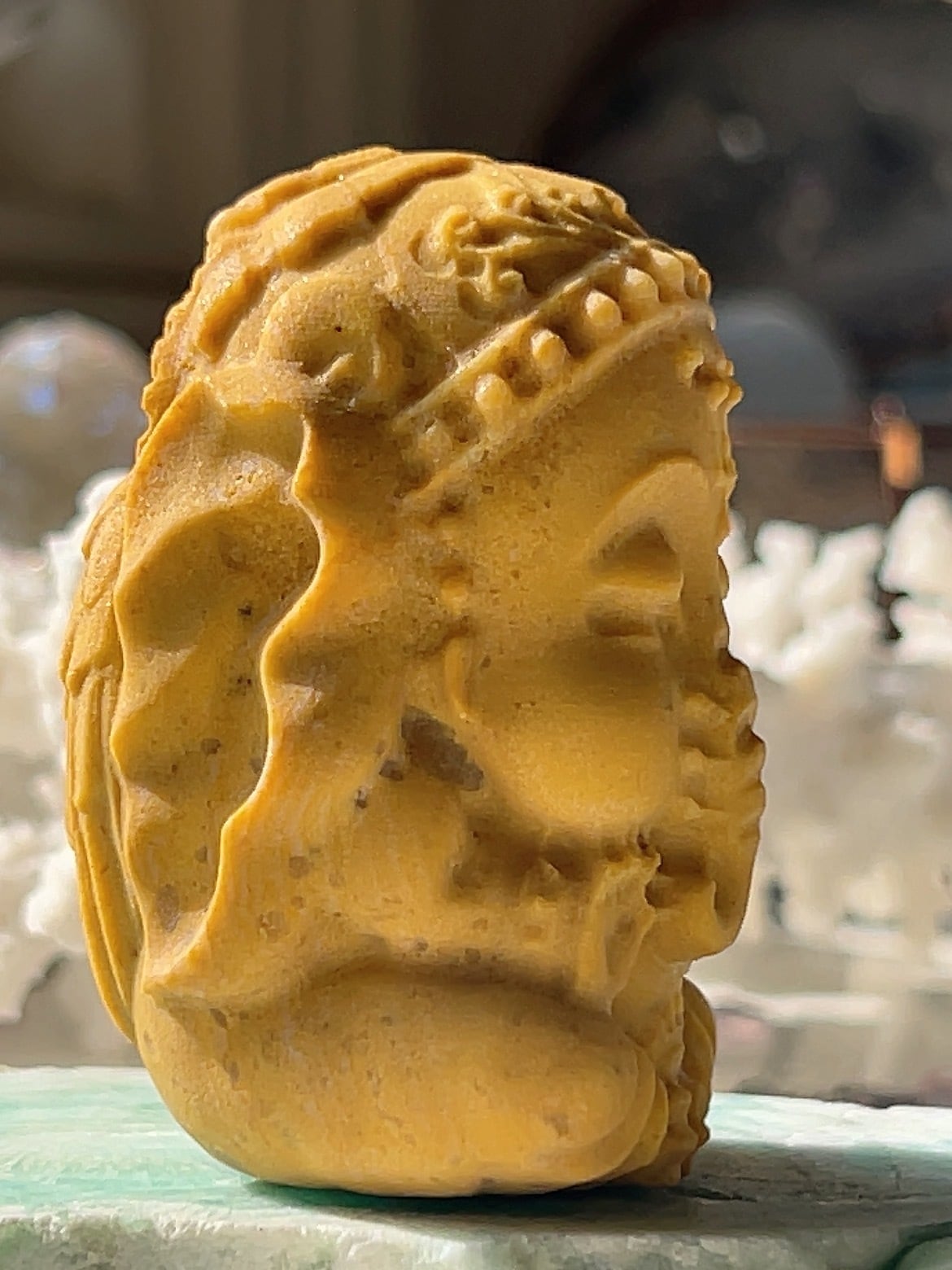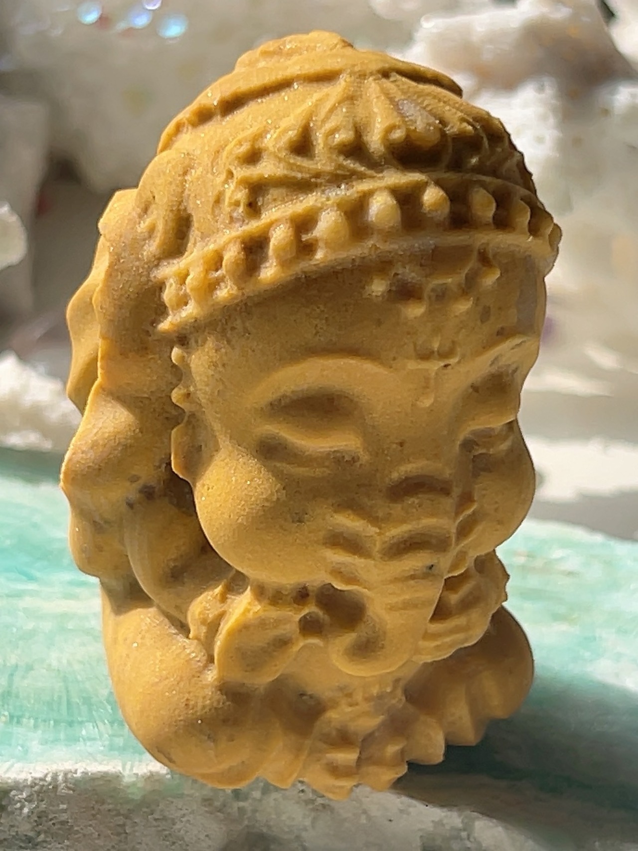 イエロージェイド(黄翡翠)のガネーシャは、富・幸運・知恵をもたらし、目標達成、金運、ビジネス運、人間関係、心身の安定、魔除けに効果があるとされます。