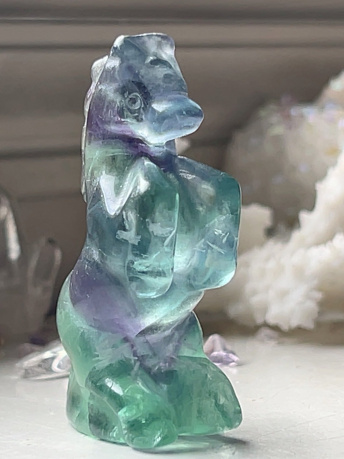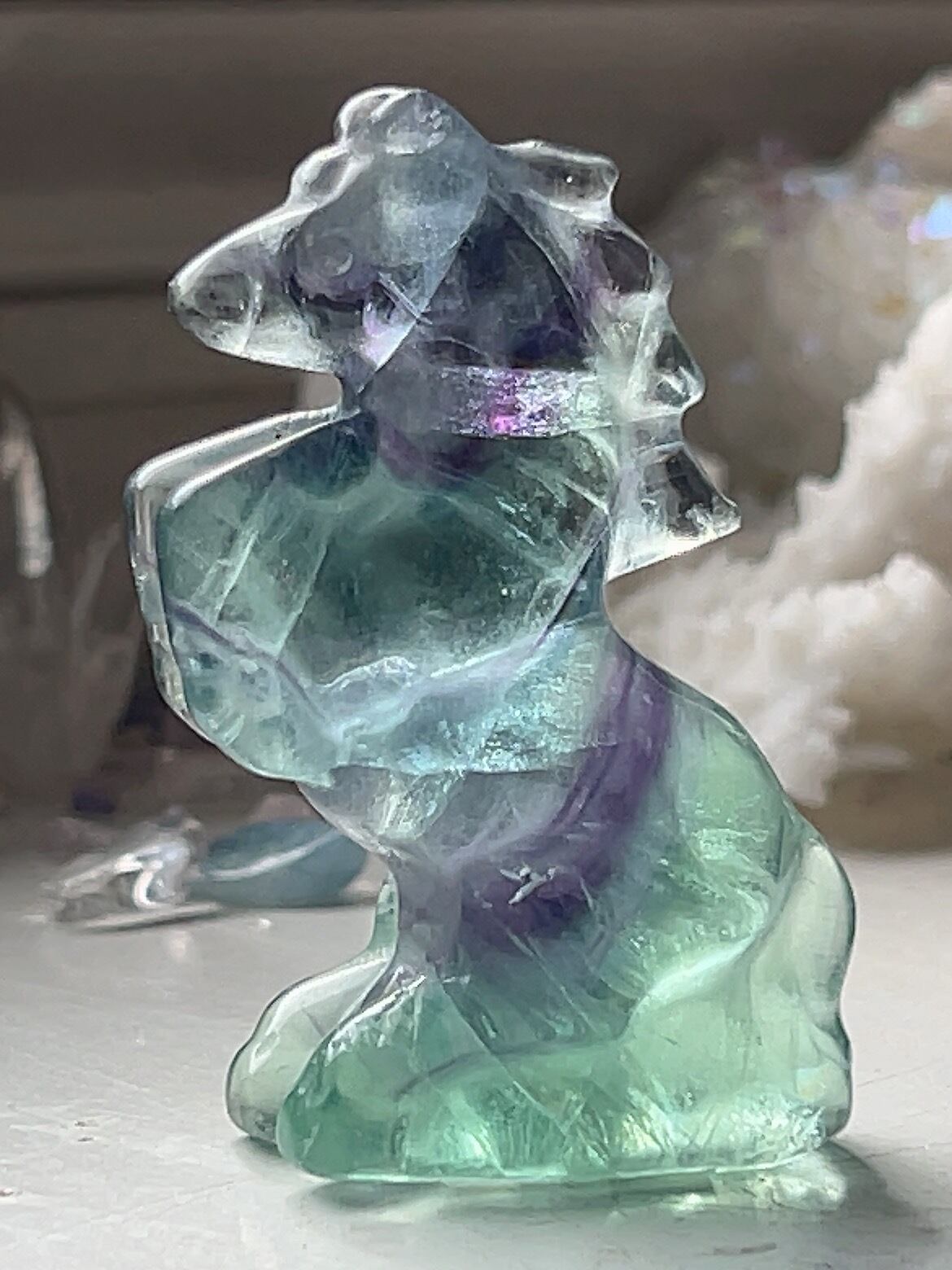 「フェザーフローライト 馬」とは、天使の羽のような内包物(フェザー)が入った希少なフローライト(蛍石)で、馬の形に彫刻された天然石のお守りや置物を指し、癒やしや直感力向上、想像力アップのパワーストーンとして人気で、特に2026年の干支(午年)としても注目されています。